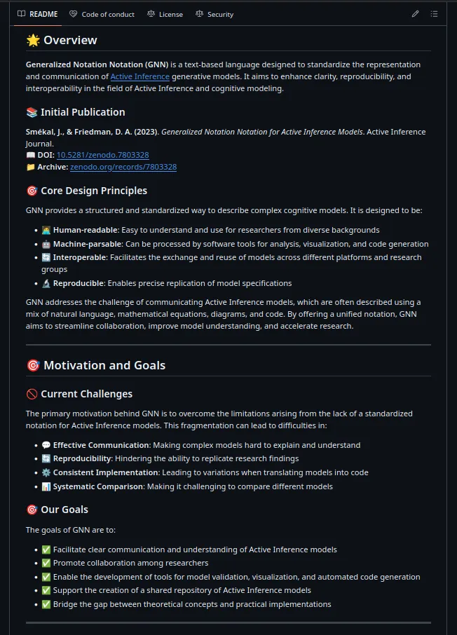 … is a text-based language designed to standardize the representation and communication of Active Inference generative models. It aims to enhance clarity, reproducibility, and interoperability in the field of Active Inference and cognitive modeling.