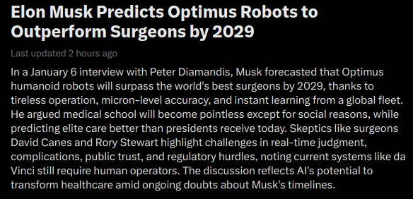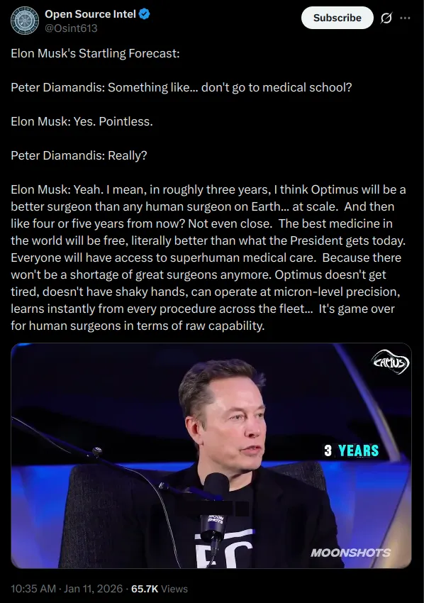 Elon Musk: Yeah. I mean, in roughly three years, I think Optimus will be a better surgeon than any human surgeon on Earth... at… pic.x.com/gIRHS3tEFK