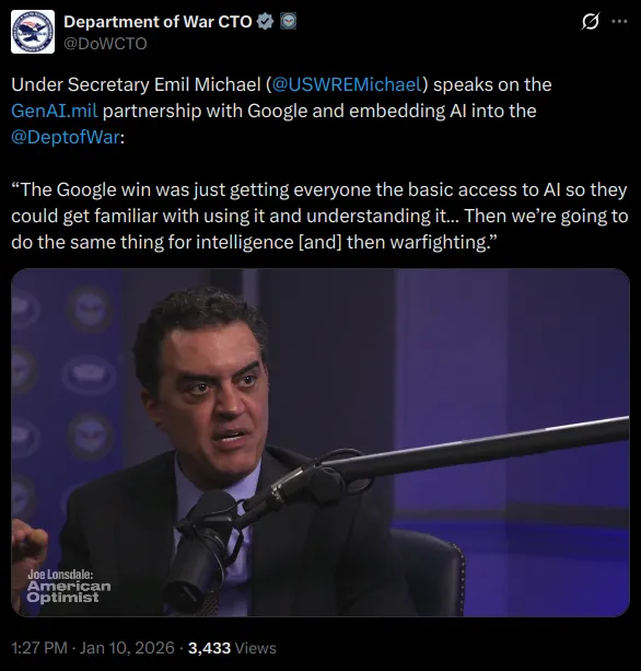 — Department of War CTO (@DoWCTO) January 10, 2026