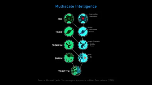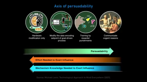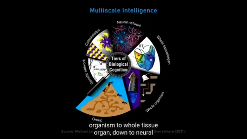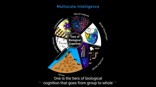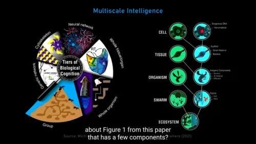 1:28:25 All physical things are interfaces to these patterns. You build an interface, some of those patterns are going to come through that interface. Depending on what you build, some patterns versus others are going to come through. The research program is mapping out that relationship between the physical pointers that we make, and the patterns that come through it, right? Understanding the structure of that space, what exists in that space, and what do I need to make physically to make certain patterns come through? Now, when I say patterns, now we have to ask, “What kinds of things live in that space?” Well, the mathematicians will tell you, “Well, we already know. We have a whole list of objects. You know, the amplituhedrons and all this crazy stuff that lives in that space.” Yeah, I think that’s one layer of stuff that lives in that space, but I think those patterns are the lower agency kinds of things that are basically studied by mathematicians. What also lives in that space are much more active, more complex, higher agency patterns that we recognize as kinds of minds, that behavioral scientists would look at that pattern and say, “Well, I know what that is. 1:29:25 That’s the competency for delayed gratification or problem-solving of certain kinds,” or whatever. And so, so what I end up with right now is a model in which that latent space contains things that come through physical objects, so simple, simple patterns, right? So, so facts about triangles, and Fibonacci; patterns and fractals and things like that. But also, if you make more complex interfaces such as biologicals and,importantly, not just biologicals, but let’s say cells and embryos and tissues, what you will then pull down is much more complex patterns that we say, “Ah, that’s a mind. That’s a human mind,” or, “That’s a, you know, snake mind,” or whatever. So I I think the mind-brain relationship is exactly the kind of thing that the math-physics relationship is, that in some very interesting way, there are truths of mathematics that become embodied, and they kind of haunt physical objects, right, in a very specific functional way. And in the exact same way, there are other patterns that are much more complex, higher agency patterns that basically inform living things that we see as obvious embodied minds.